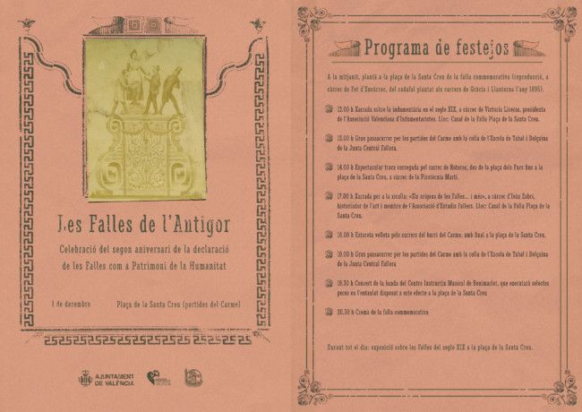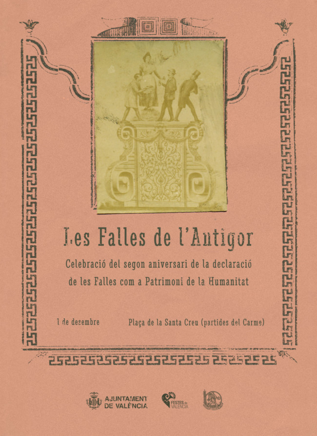 Con motivo del segundo aniversario de la inclusión de las Fallas en la lista de Patrimonios Culturales Inmateriales de la Humanidad por la UNESCO, el Ayuntamiento, mediante la Concejalía de Cultura Festiva y en colaboración con la Delegación de Promoción del Patrimonio de Junta Central Fallera (JCF), ha presentado el programa de festejos, cuyo lema es Les Falles de l’Antigor y que se centra en los inicios de las Fallas, a finales del siglo XIX. Se celebrará en el barrio del Carmen durante el próximo sábado 1 de diciembre.