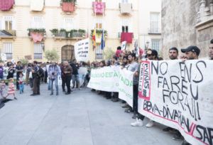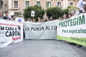 Llegando al Ayuntamiento, donde la Plataforma d’Afectades per l’Habitatge (PAH València) ha leído un escrito en el que ha denunciado que diez años después de su nacimiento, continúa habiendo un gran número de desahucios a los que no se les pone solución. Han reivindicado la necesidad de un parque público de vivienda y que habría de construirse a partir del stock de viviendas vacías que acumulan los bancos rescatados por el Gobierno.