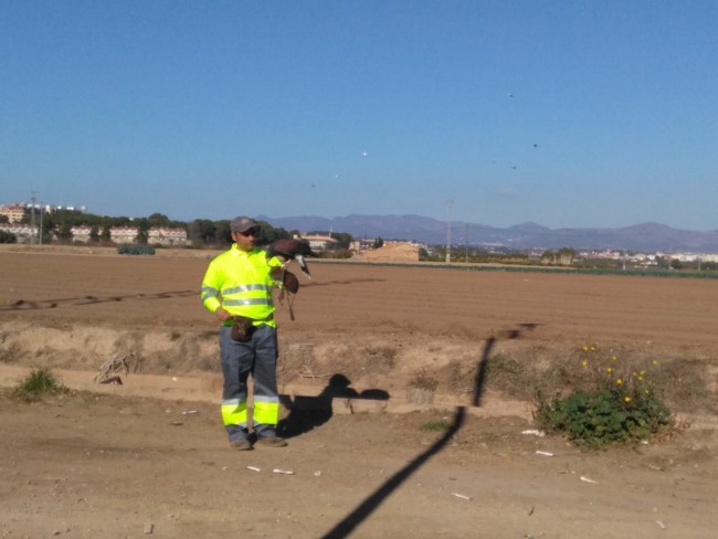 Hoy se ha celebrado la primera sesión de un plan de choque que consta de 15 vuelos disuasorios en un periodo aproximado de un par de meses. El trabajo consiste en que el cetrero lleve a las águilas primero y después a los halcones a la zona de actuación, donde ahora las palomas se alimentan y anidan, y las deje volar durante unas horas. Ello hará que que las aves perciban la presencia del depredador en diferentes momentos del día y en diferentes días y dejen de considerar los huertos de Burjassot como una zona segura.
