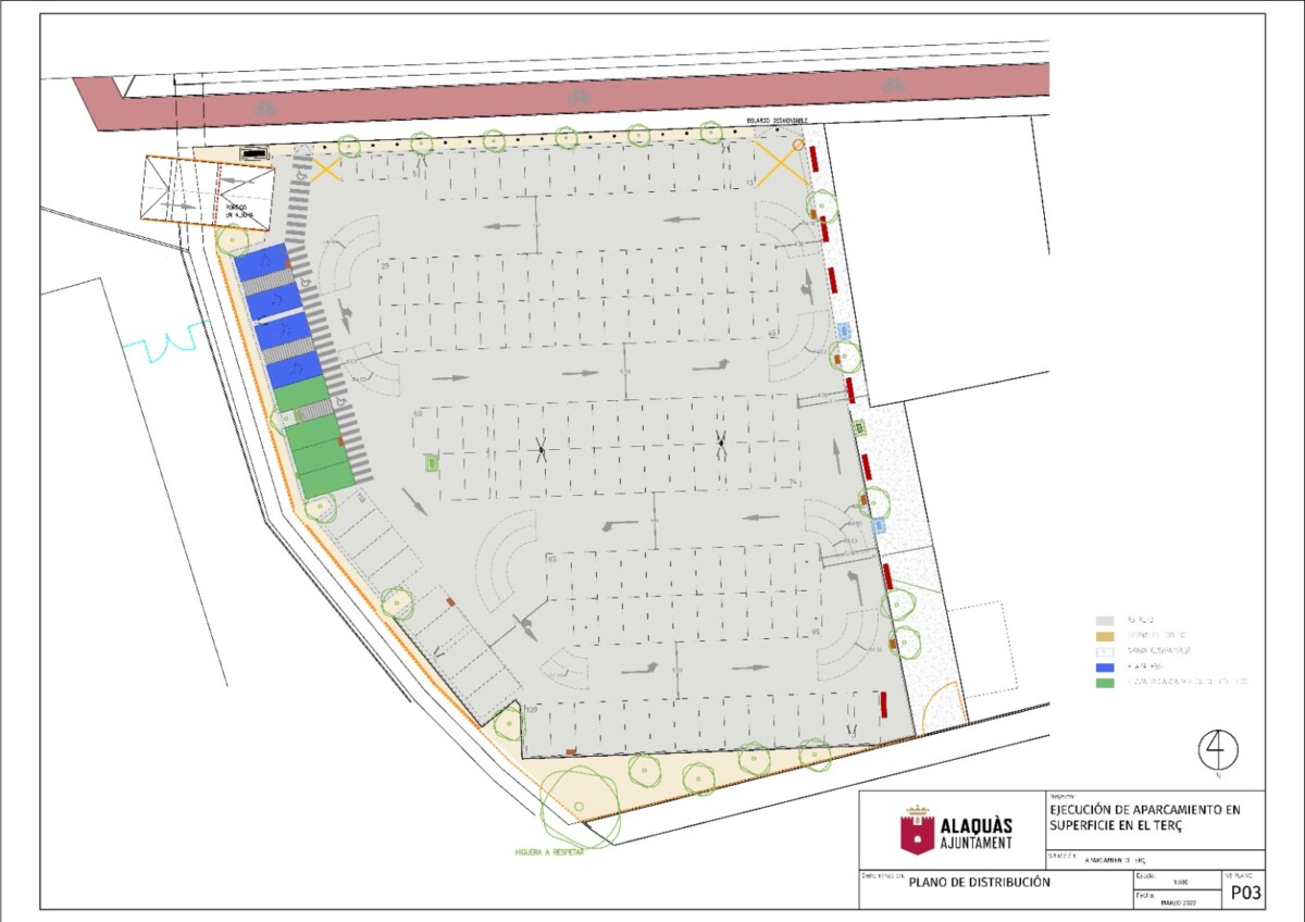 El ayuntamiento de Alaquàs ha anunciado la construcción de un nuevo aparcamiento en superficie junto al Polideportivo Municipal del Terç, concretamente en una parcela junto a los actuales huertos urbanos. El plazo previsto para su puesta en marcha es de 5 meses y cuenta con un presupuesto de 394.544 euros.