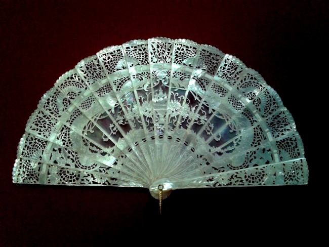 Palmito de nacre mareperla blanc d'estil isabelí tardà. Varillatge calat, gravat i lacat amb pa d'or i plata. Medalló central amb figures esculpides. País de paper pintat a mà al gouache. Està signat pel seu autor. Les formes de les varetes d'estil isabelí són arredonides. La proporció entre varillatge i país és singularment característica: Font gran (part inferior del ventall) i país xicotet (part superior). L'ornamentació està inspirada en volutes i motius florals barrocs.