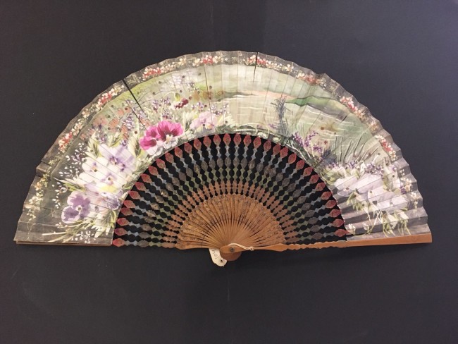 Palmito d'estil “Art Nouveau” o Modernista. Varillatge d'os i país de seda pintat a mà al guaix i brodat amb minúsculs lluentons. Després de la I Guerra Mundial, la desbordant alegria de gaudir la vida comporta un gran canvi en l'art europeu. L'asimetria, voluptuoses formes vegetals i colorit alegre defineixen l'Art Nouveau. Este ventall és una mostra significativa d'aqueix nou estil destrossador. Cal destacar el disseny i colorit d'esta peça i la grandària dels lluentons, cosa que ha fet necessari fabricar agulles de mesura especial per a la seua restauració.
