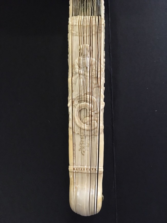 Palmito de marfil, calat i tallat. Destaca el treball de tallat el seu interior i l'exterior. En la boleta del ventall (lloc on es fixa el clau o eix) es veu una minúscula escena de dos personatges orientals sobre un pont i dues aus.