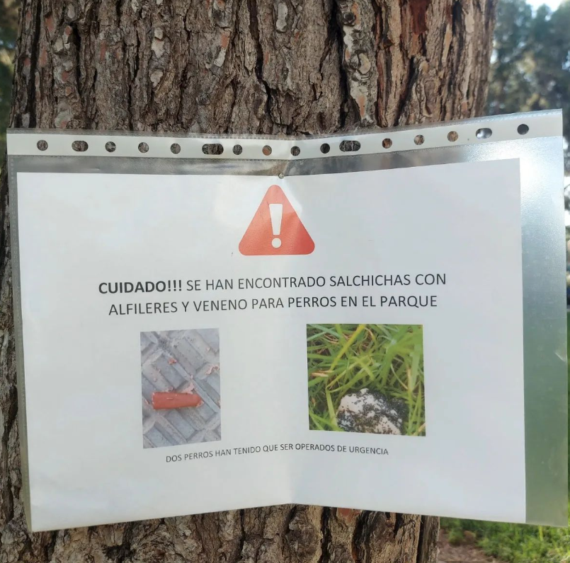 Las plataformas digitales han difundido imágenes de carteles que han sido encontrados en el parque cercano a la Avenida de Torrent, cerca del Restaurante Saona, específicamente en la calle Comare Pilar Martí. Estos carteles alertan sobre la presencia de salchichas envenenadas con alfileres en la zona. Según los informes, dos perros han sido sometidos a cirugía de emergencia después de consumir estas sustancias peligrosas.