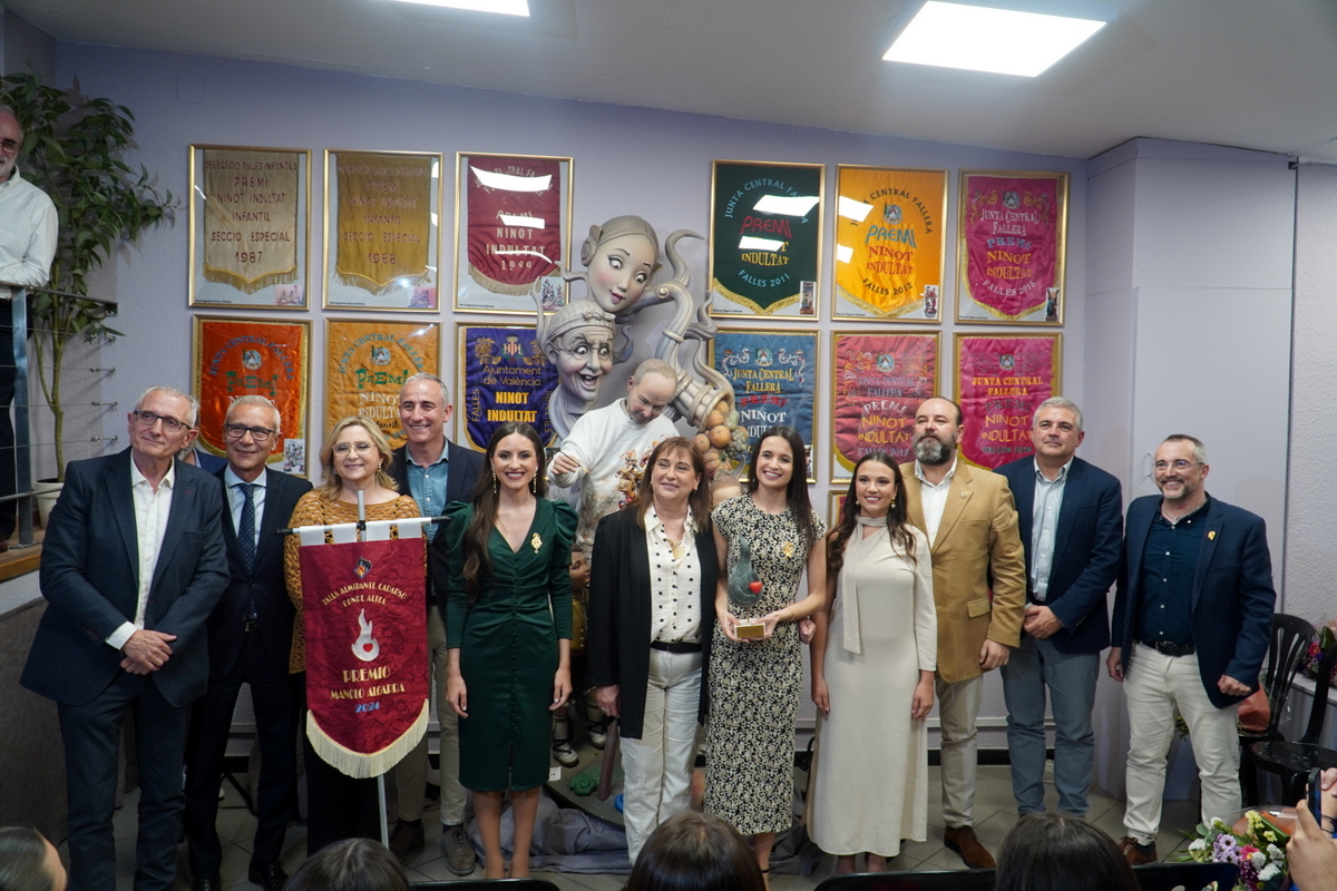Los invitados de la noche fueron los componentes de la falla Monestir de Poblet-Aparici Albiñana, L'Antiga de Campanar, con sus presidentes Rafa Mengó, Xelo Salavert y Quique Soler al frente, que recogieron el premio Manolo Algarra 2024 en reconocimiento al arte y talento desplegado en el ninot ‘Horchatería L’Antiga'. Una bella escena hiperrealista creada por Josué Beitia que representa una escena entrañable con un abuelo y su nieta tomando una horchata con fartons en una horchatería, con un perro junto a ellos, y que en su día enamoró a tantos visitantes de la Exposición del Ninot, expresando la voluntad popular que la convirtió en Ninot Indultat 2024.