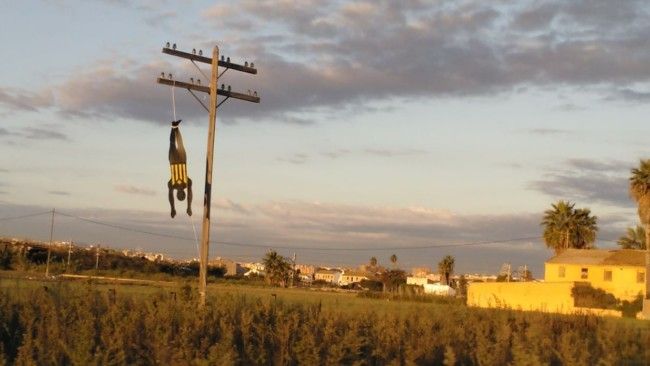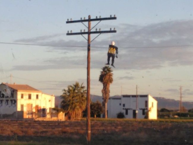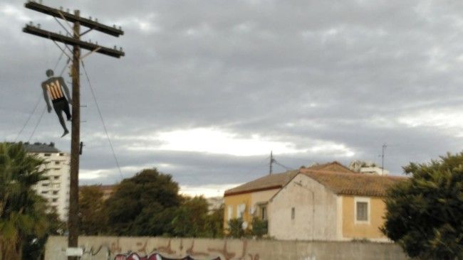 Con este clima de creciente tensión ya en marcha, esta mañana han aparecido muñecos ataviados con la bandera estelada 'ahorcados' en postes junto a la A-7, desde la pasarela que comunica Port Saplaya con la huerta de Alboraya, hasta la misma entrada a la ciudad de Valencia. Al menos se han podido ver cuatro de estos muñecos que presentan la bandera independentista en pecho y espalda.