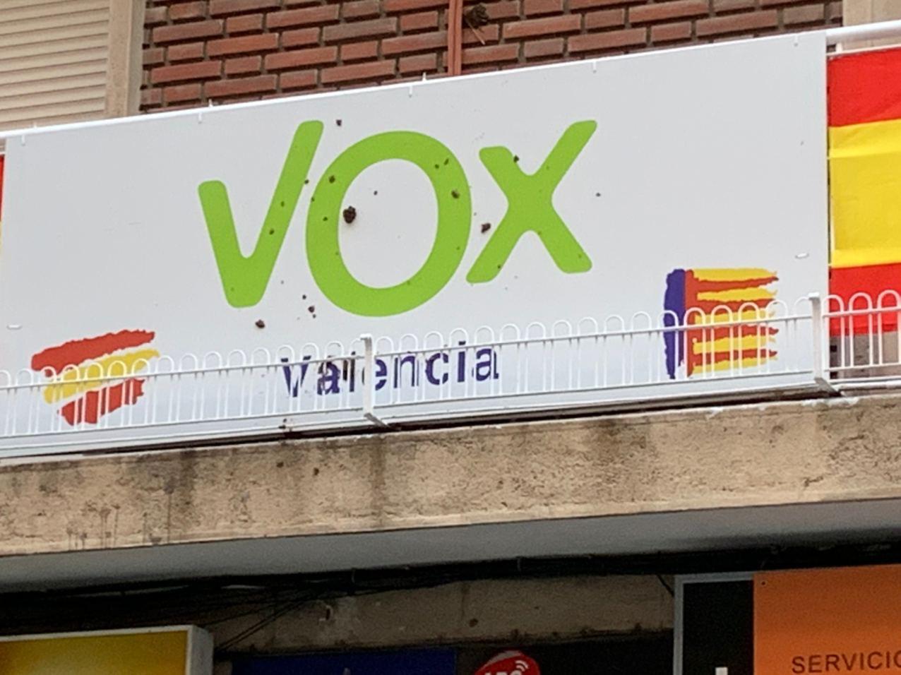 El cartel con el logo de VOX, que está en el balcón principal de la sede en Valencia, ha aparecido manchado con pelotas de barro. Además, también ha aparecido varias veces una imagen del Presidente de VOX, Santiago Abascal, con un tiro en la frente en un paso de cebra de la calle Botánico Cabanilles, cerca de los Jardines del Real.