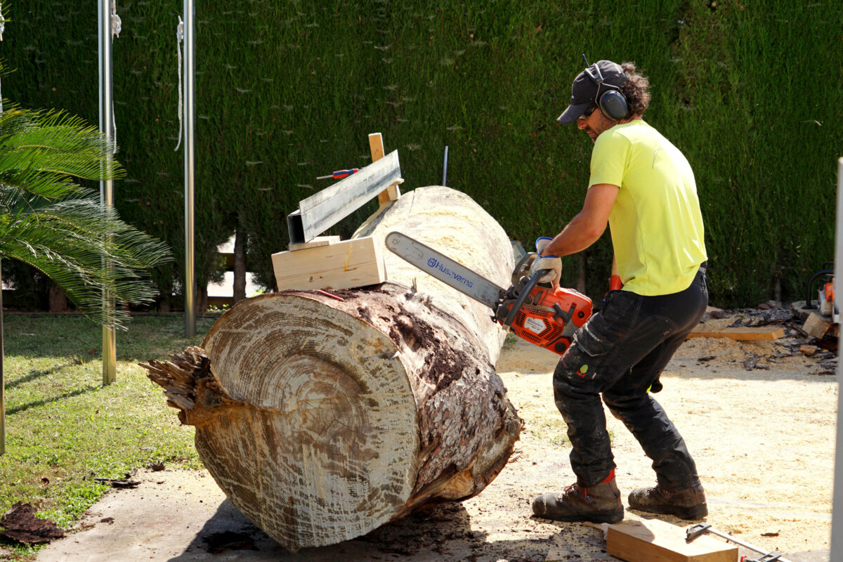El proceso de transformación se inició coincidiendo con la celebración de la Feria Asociativa y Comercial del municipio, para invitar a la población a seguir en vivo y en directo los trabajos del escultor especializado en tallas de madera con motosierra.