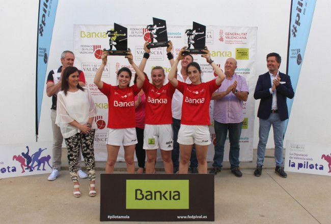Entregaron los trofeos a las finalistas José Daniel Sanjuán, presidente de la Federación de Pilota Valenciana, Rosa Piqueras, directora Comercial de Bankia Valencia y Castellón, Salvador Masaroca, alcalde de Beniparrell, Vicen Martínez, concejala de deportes de Beniparrell y Julio García, alcalde de Alcàntera del Xúquer.