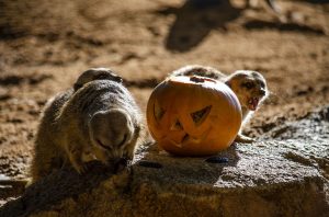 Algunos de los hábitats que se recrean en Bioparc Valencia han amanecido hoy con una ornamentación muy diferente a la habitual. Así, telarañas gigantes, murciélagos, guirnaldas de fantasmas, lápidas y ataúdes llamaban la atención de los animales a la salida de sus recintos. Pero, sobre todo, las calabazas que portaban en su interior deliciosos manjares para cada especie animal, despertaban sus instintos y eran el centro de atención.