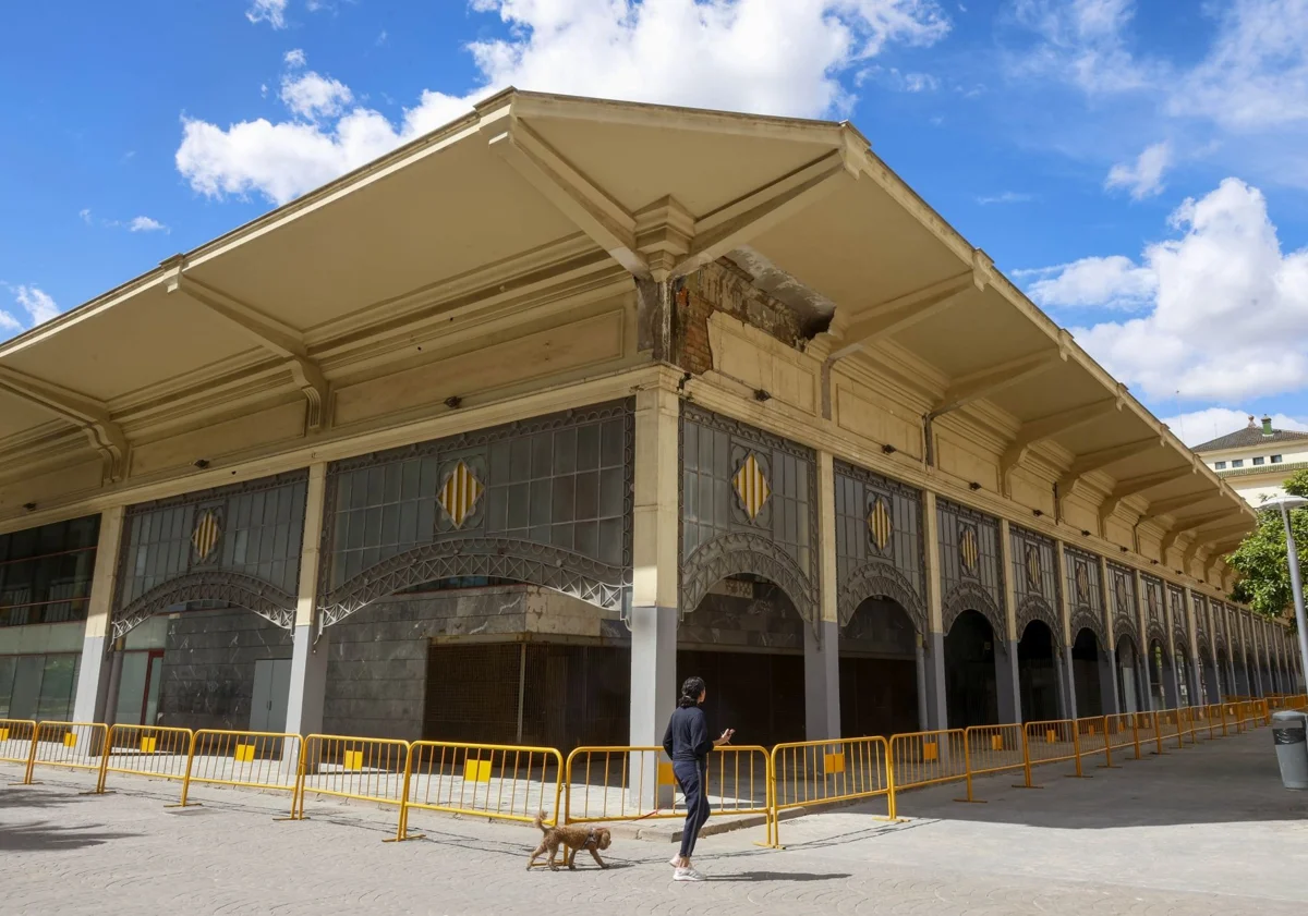 Una moldura decorativa de escayola se desprendió de la fachada del complejo de Abastos en Valencia, en una zona que ya estaba vallada debido a trabajos de intervención. Bomberos del Ayuntamiento de Valencia han comenzado la revisión del incidente.