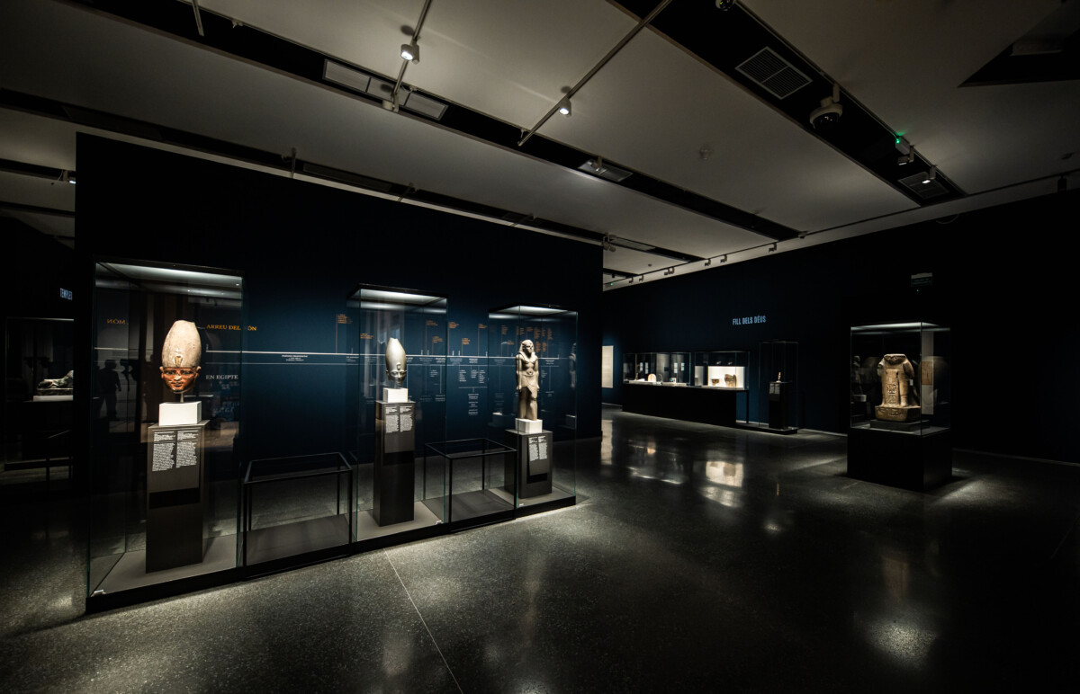 La exposición muestra el rostro de los faraones, que impresionan por su seriedad; también, escenas de coronaciones en las que aparecen rodeados por dioses, en medio de una explosión de alegría, y estelas donde los vemos con los brazos cruzados —postura que se asocia a Osiris—, transformados a su vez en dioses. Junto a la presencia fascinante de las obras de arte, los textos nos permiten reconstruir el contexto en el que se crearon, e introducirnos en los escenarios de la vida de los faraones: el templo, el palacio, las fiestas, la memoria, las formas de legitimar y transmitir el poder, el más allá…