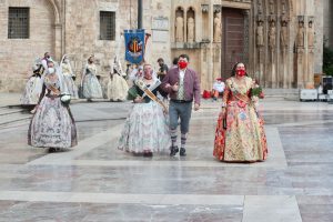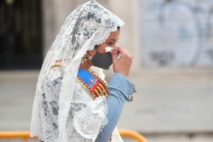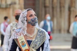 El primer turno de la Ofrenda a la Mare de Déu dels Desamparats, primera de la historia que se celebra sin público en el marco de las medidas de seguridad frente al coronavirus, ha terminado con el paso de la Fallera Mayor Infantil de València, Carla García.