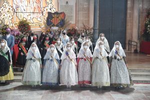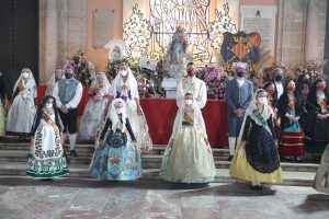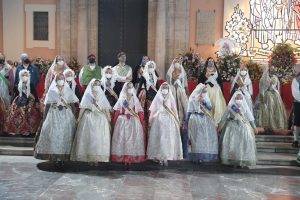 La jornada sí ha finalizado, como es habitual, en la Basílica con la entrega del ramo de la Fallera Mayor Infantil y su Corte de Honor a la imagen de la 'Maredeueta' que se encuentran en ella.
