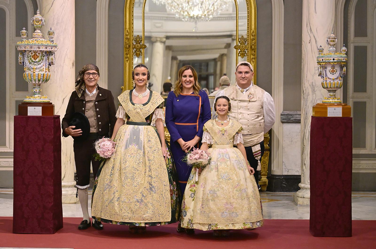En el Salón de Cristal, antes de realizarse la primera sesión fotográfica a las nuevas Falleras Mayores de Valencia con su indumentaria oficial solas y acompañadas de sus respectivas Cortes de Honor, se procede a la entrega de sendos alfabeguers de cerámica, un presente que el Ayuntamiento de Valencia tiene con las Falleras Mayores de Valencia año tras año desde 2005.