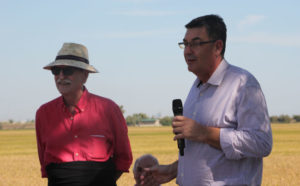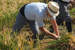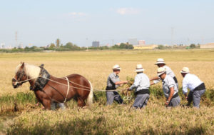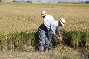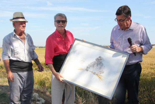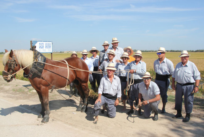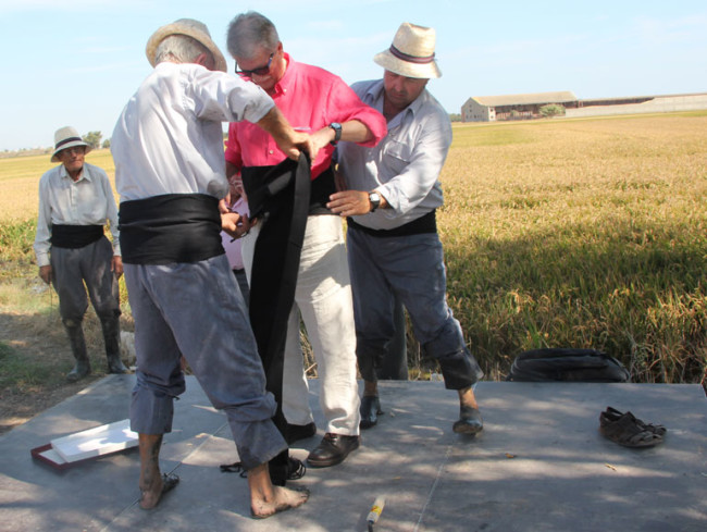 Pero era ja migdia, l'hora de l'acte central del matí: La Sega de l'Arròs. La colla de segadors, ataviats amb la indumentària tradicional, amb camises blaves, faixa negra i descalços, entraven al camp d'arròs davant del centenar de persones que s'havien congregat al voltant per a presenciar la sega. Amb mestratge heretat, els segadors van emprar tot el seu ofici amb les tradicionals corbelles, segant les tiges amb rapidesa.