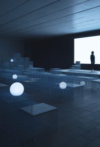 The Sea se convierte en un espacio permeable que tiene más o menos opacidad según la composición de los módulos y la posición del espectador. El juego de las rejillas crea diferentes profundidades y juega con el público que al entrar en este espacio parece estar sumergido dentro del mar.