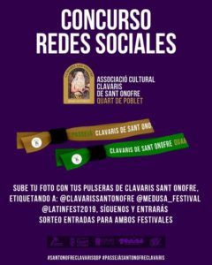 Este año, como novedad, la Clavaría ha preparado un concurso para los más jóvenes. La idea es llegar al público más joven para que se involucren con la cultura festiva y las tradiciones de Quart de Poblet. Los más jóvenes, que adquieran la pulsera de Sant Onofre, podrán participar en el sorteo de entradas para el festival LatinFest y para el festival Medusa. Para ello deberán subir una foto a sus redes sociales etiquetando a @ClavarisSantOnofre, @Medusa_Festival y @LatinFest2019