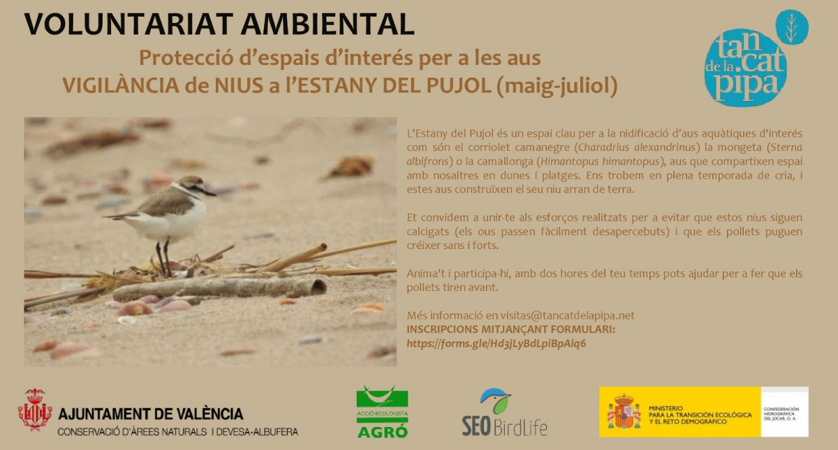 Las entidades ambientalistas que gestionan l’Estany del Pujol y el marjal de Rafalell i Vistabella, SEO Birdlife y Acció Ecologista-Agró, comienzan un programa de voluntariado ambiental para la vigilancia del chorlitejo patinegro que descansa en estos dos parajes naturales ubicados al sur y el norte de la ciudad de València, respectivamente. El vicealcalde de la ciudad y concejal de Ecología Urbana, Sergi Campillo, ha afirmado que “las playas no son solo un lugar para bañarnos y disfrutar del sol sino también un espacio de vida de especies de animales y de plantas que necesitan sobrevivir y reproducirse”.