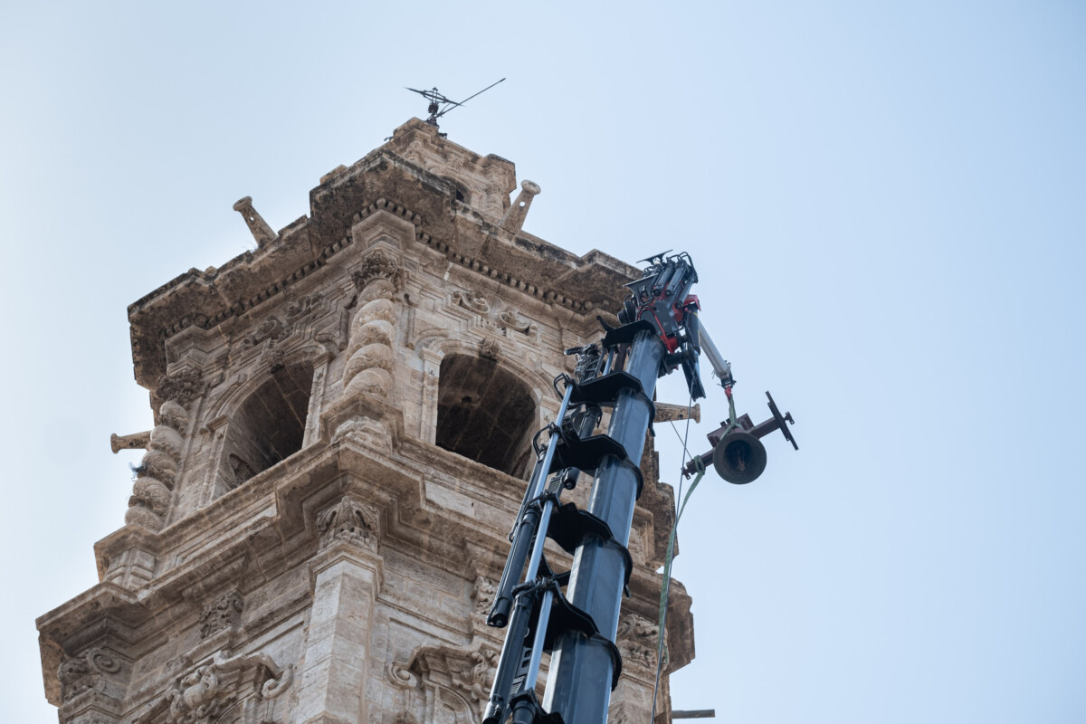 La empresa 'Grúas Alapont' se encargó de llevar a cabo el descenso de las campanas durante la primera parte del día. Estas piezas serán trasladadas al taller del fundidor Gabriel Rivera en Montehermoso (Cáceres), junto a las campanas 'El Peret' y 'Juliana-Clara', que ya se encontraban en el templo y también serán sometidas a procesos de restauración.