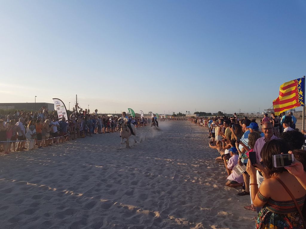 La 'correguda de joies' es una competición ecuestre en que los jinetes recorren, a lomos de sus caballos y sin montura, 700 metros de playa en duelos eliminatorios hasta obtener el trofeo, la 'joia' o pañuelo de seda que cuelga de una corona de laurel y que, antiguamente, se regalaba a la persona amada al finalizar la carrera.
