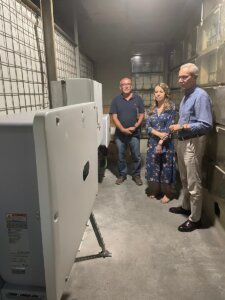 Con relación al campo solar, se ha elegido una disposición inclinada de los módulos, montados sobre la cubierta del edifico, y con una inclinación de 15 grados. Esta disposición permite por una parte aprovechar al máximo la superficie disponible. Por otra parte, los módulos se fijan mediante grapas de sujeción a la estructura metálica de soporte. La instalación incluye un sistema de gestión de vertido que controla las dos fuentes de energía, fotovoltaica y red eléctrica, con el fin de maximizar la producción de energía renovable y, al mismo tiempo, garantizar la inyección de energía sobrante a la red eléctrica.