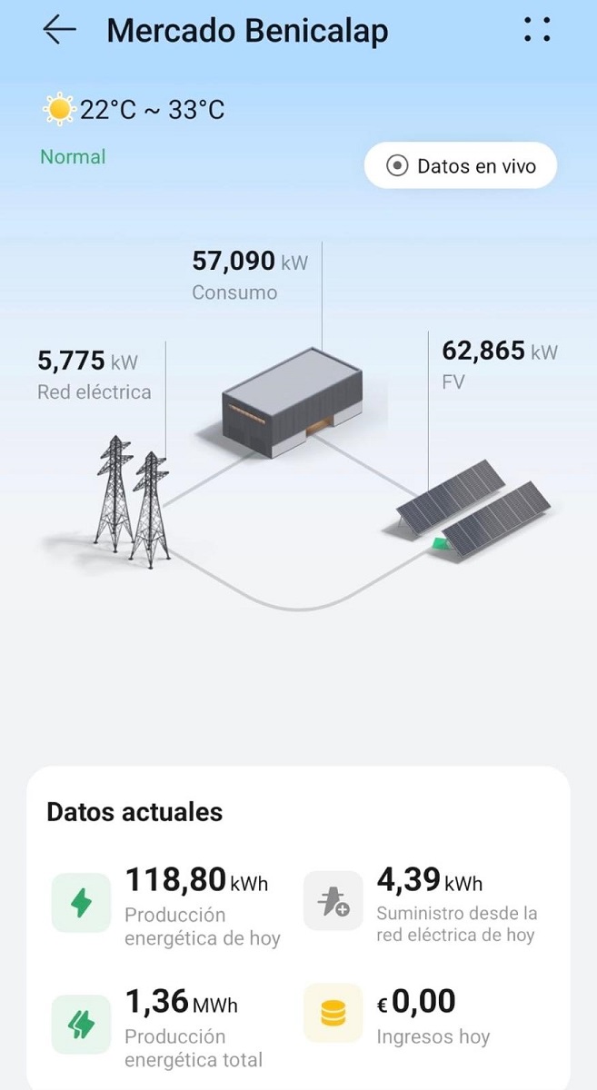 La instalación solar fotovoltaica está proyectada sobre la cubierta de los edificios existentes, con una potencia, en el caso del mercado de Benicalap, de 162 kW pico. La instalación está formada por un total de 302 módulos fotovoltaicos y dos inversores de 60 kW nominales, que suministrarán a la instalación eléctrica existente toda la energía producida en modalidad autoconsumo con excedentes. La previsión de producción de energía es de 205.500 kWh anuales, con una media anual de cobertura del consumo energético del edificio superior al 70 %, que puede llegar al 100 % en los meses de mayor intensidad solar. En su conjunto, la potencia instalada en los 5 mercados municipales es de 1.028 kW pico.