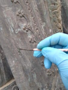El personal especializado ha procedido también al estucado de diversas perforaciones que salpicaban la obra. Se trata de poros y pequeños fallos de fabricación, pero que era importante sellar para evitar cualquier posible entrada de agua al interior de la estatua de Vinatea. La limpieza física y química se ha llevado a cabo en dos fases. En la primera se usaron cepillos de cerdas sintéticas y en la segunda se acometió una limpieza más profunda mediante una solución al 50% de alcohol y acetona con esponjas.