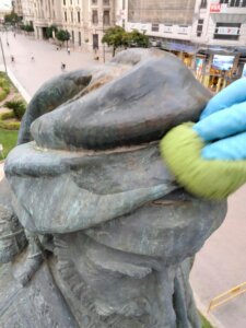 El Servicio de Patrimonio Histórico y Artístico del Ayuntamiento de Valencia ha dado por concluida la intervención en la escultura de bronce de Francesc de Vinatea, sita en la plaza del Ayuntamiento, después de que un ciudadano alertara de la existencia de una fisura en la espalda. Además de sellar la grieta, que en realidad era una microfisura, la empresa encargada ha eliminado “una ingente cantidad de detritus de paloma que cubría la figura de forma generalizada”, tal como explica el informe final de Noema Restauradores.