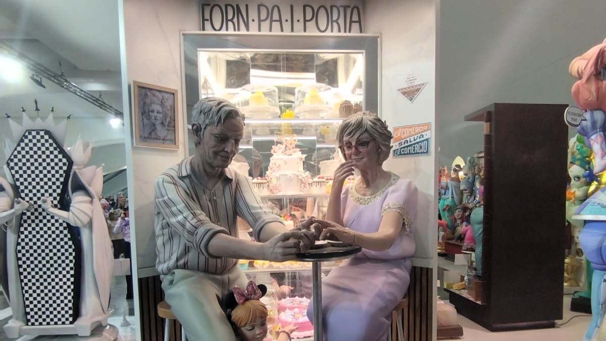 El ninot 'Un poble d'Or que ajuda en lo cor' forma parte de la falla 'Or', que planta esta comisión del sector La Roqueta-Arrancapins. La escena muestra a una pareja de ancianos merendando en un horno de Paiporta --una de las localidades de l'Horta Sud más afectadas por la dana-- y una niña con un carrito de juguete.