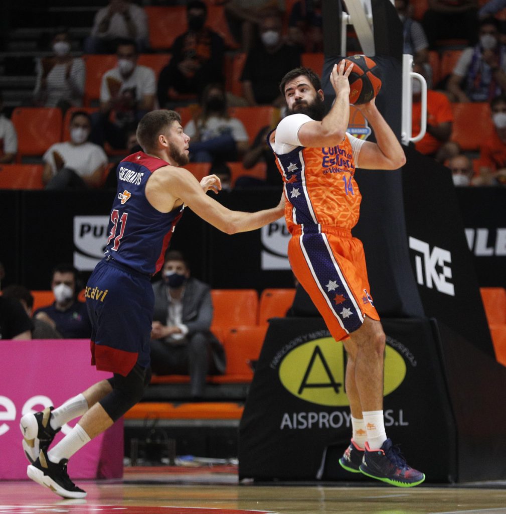 Un mate del pívot taronja replicó a la canasta inicial de Sedekerskis y un triple de Kalinic desde la esquina puso por primera vez por delante al equipo taronja.