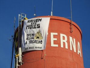 Para su entrega, el colectivo Marfull Acció Ecologista-Agró descolgó este domingo, pese a las fuertes rachas de viento, una pancarta de 6x4 metros con el lema ‘Salvem Les Moles’. El lugar escogido para la realización de esta acción pacífica reivindicativa, el depósito elevado de agua ubicado en el parque empresarial Táctica, sirve a los activistas como alegoría para "protestar contra el abismo hacia el cual los especuladores de la mano de nuestros gobernantes, abocan a la sociedad civil en plena emergencia climática y escasez de recursos".