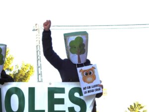 Al mismo tiempo, otro grupo de activistas, entre ellos miembros de la Coordinadora por la Protección de les Moles, permanecieron a los pies de la infraestructura con una pancarta de la plataforma y otras más pequeñas en defensa de la conservación del paraje natural, del uso lúdico y respetuoso que el pueblo hace del mismo y a favor del comercio local. ‘No permitas que una multinacional nos arruine’, ‘Vull vida saludable a Les Moles’, ‘No me quites Les Moles’, ‘No nos sustituyas por un centro comercial’, son algunos de los mensajes que se podían leer en los carteles individuales, acompañados de dibujos de animales y plantas, que claman de esta forma a través de los ecologistas ‘Les Moles son mi casa, no las destruyas’, ‘No me quites mi casa’.