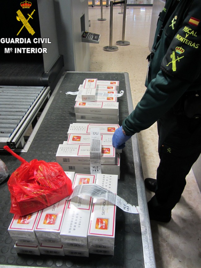 En otra actuación realizada por la Guardia Civil el pasado día 18 de abril en el aeropuerto de Manises se levantó Acta-Denuncia a dos varones de nacionalidad china de edades comprendidas entre los 44 y 47 años, que intentaban entrar 390 cajetillas de tabaco camufladas en sus equipajes en un vuelo procedente de China vía Frankfurt (Alemania). Se procedió a una sanción, como supuestos autores de una infracción a la Ley de Contrabando.