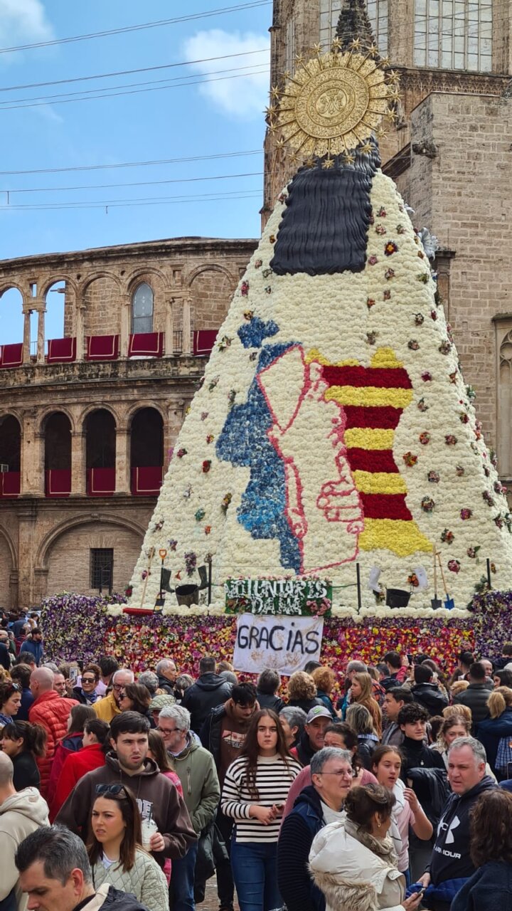 Precioso día soleado por fin en la ciudad que coincidió con la festividad de San José y el Día del Padre. Valencia celebró la Ofrenda de Flores a la Virgen de los Desamparados y hoy fue en espectacular día para acercarse a la plaza y poder contemplar y oler el manto que luce este año nuestra Virgen de los Desamparados, un evento lleno de color y emoción. El manto de la Virgen, confeccionado con miles de claveles, se ha convertido en un homenaje más a los afectados por la DANA del pasado octubre y un recuerdo a los fallecidos.