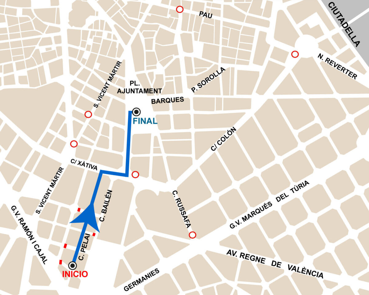 Las restricciones al estacionamiento se iniciarán este viernes desde las 22:00 horas y afectarán a las calles de Pelai, Vives Liern, l’Ermita, Julio Antonio y Matemàtic Marzal. También en la zona de carga y descarga y de estacionamiento de bicicletas de la calle Xàtiva, frente a la Estación del Norte y hasta el número 10, así como en la zona de carga y descarga frente al edificio de Telefónica de la plaza de l’Ajuntament y en la zona de aparcamiento de bicicletas de la esquina con Periodista Azzati.
