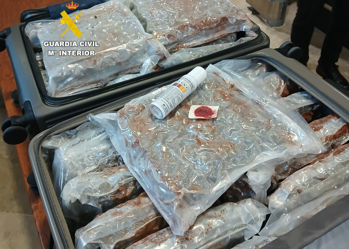 Abiertas en su presencia, las maletas contenían una gran cantidad de paquetes plastificados al vacío y una sustancia vegetal a la que, aplicándole el reactivo detector de drogas, dio como resultado positivo en Cannabis-Marihuana.