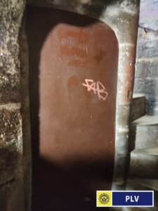 Al ver la grabación de las cámaras se observó que la misma persona había estado realizando pintadas en otras zonas del edificio: en la pared de la subida a la torre, en la puerta metálica de la sala de campanas, en el mojón kilométrico del Instituto Geográfico Nacional y en la valla de la terraza.