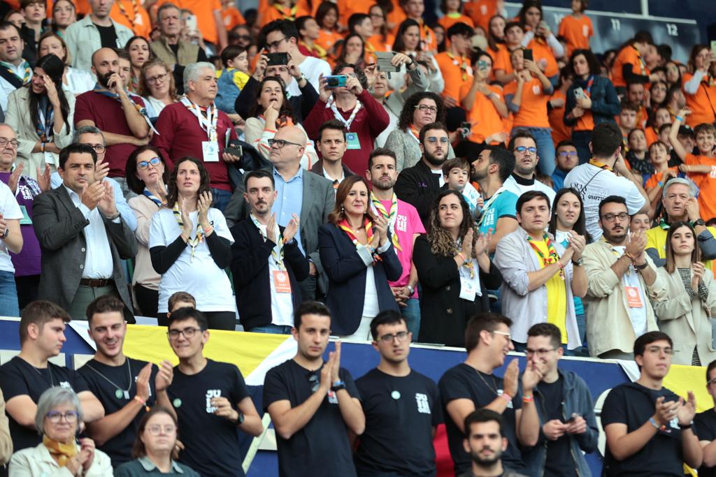 La imagen peregrina de la Virgen de los Desamparados ha entrado en el campo a hombros de personas voluntarias, colocándose en el altar para el inicio de la misa, que ha estado presidida por el Arzobispo de Valencia, monseñor Enrique Benavent, y concelebrada por el Obispo Auxiliar, monseñor Arturo Ros, el Obispo Auxiliar Emérito, monseñor Javier Salinas, el Vicario General, monseñor Vicente Fontestad, el Consiliario Diocesano, Domingo Pacheco, y todos los Consiliarios Juniors que han acompañar al Movimiento en este aniversario. En el palco de autoridades, por su parte, han seguido la ceremonia la alcaldesa de Valencia, María José Catalá, el secretario autonómico de Familia y Servicios Sociales, Ignacio Grande, y el director general del Instituto Valenciano de la Juventud (IVAJ), Vicent Ripoll, entre otras.
