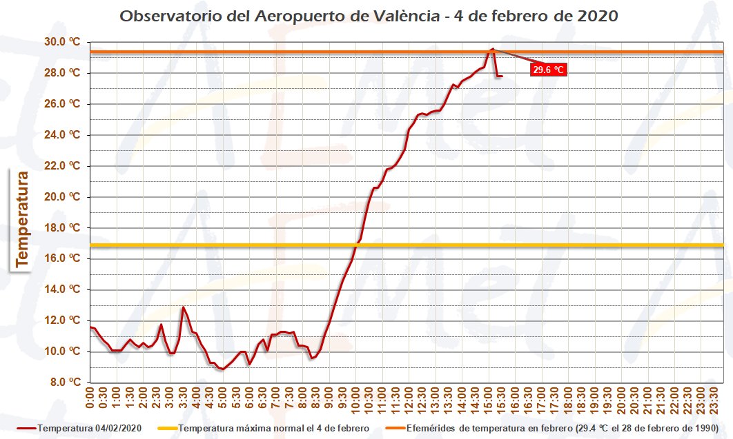 No es el del Aeropuerto de Manises un caso aislado. En la ciudad de Alicante se ha registrado una máxima de 28,6 grados a las 15.30 horas, el cuarto registro más alto para un mes de enero o febrero desde 1859.