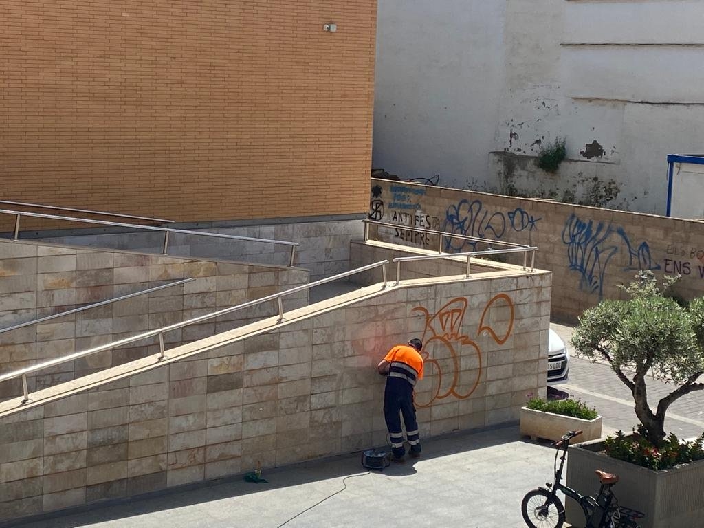Una fachada en la que se pueden ver pintadas sobre las que el consistorio ha tenido que intervenir. ''Estamos limpiando la fachada del Auditorio Municipal tras la pintada vandálica que ha sufrido recientemente'' explicaban las mismas fuentes en la publicación.