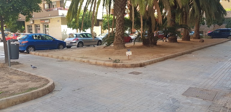Por otro lado, en la jardinera con palmeras de la calle de Xalans se plantarán arbustos de sombra; Clivias, Acanthus, Liriopes y Polygonum. Y tanto a los dos grandes alcorques próximos al paso de peatones como la jardinera de las palmeras de la calle de Xalans se realizará con un pavimento alveolar de hormigón de entre 1,00-1,20 metros de anchura para facilitar el paso a las aceras.