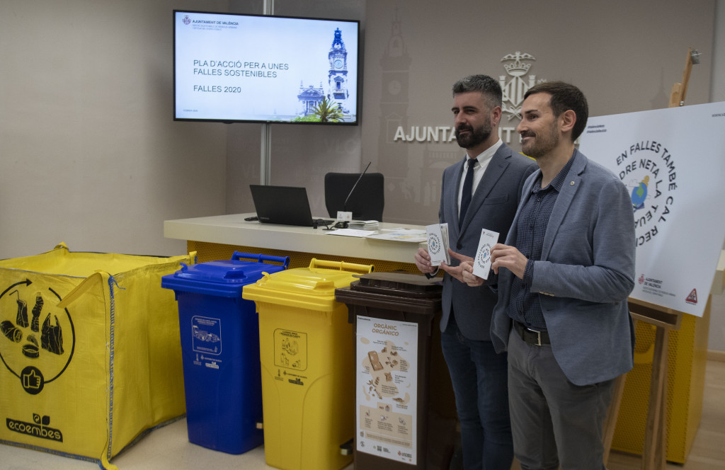 El vicealcalde y concejal de Ecología Urbana, Sergi Campillo, y el de Cultura Festiva, Pere Fuset, han presentado conjuntamente el , que incluye toda una batería de actuaciones como la colocación de carteles en el mobiliario urbano de la ciudad en los que puede leerse «En falles també cal reciclar i mantindre neta la teua ciutat», la elaboración de una «Guía de Consejos para unas Fallas Sostenibles», el reparto de papeleras y vasos reutilizables en todas las comisiones falleras de la ciudad, la ubicación de puntos verdes de información y de váteres y urinarios portátiles, en un número que duplica el del pasado año..