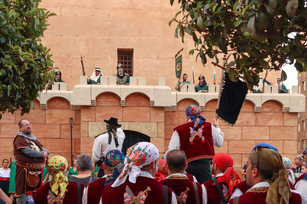 El acto empezó con una representación teatral donde los moros empezaban a ver peligrar el dominio del emblemático monumento que dos días antes habían conquistado. Instantes después, los aledaños de la plaza mayor se llenaron de sonido y pólvora, anticipando, así, el inicio de una nueva batalla.