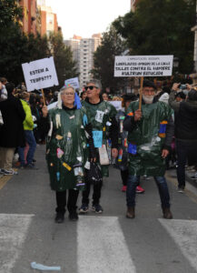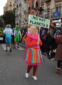 El barrio de Russafa se ha vuelto a envolver en color, música, baile y fiesta, para desfilar en Carnaval con la emergencia climática y el 'No a la Guerra' como temáticas subyacentes para darle un poso de compromiso social a la cita.