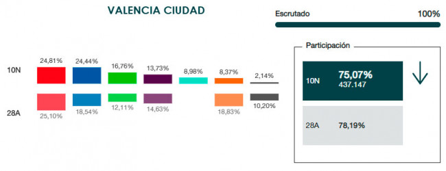 Así, la suma de PP, Ciudadanos y VOX ha logrado 215.355 votos en la capital del Túria, frente a los 206.438 logrados por la suma de PSOE, Més Compromís y Unidas Podemos.