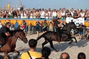 En esta fiesta, organizada por la Associació Corregudes de Joies i Sant Antoni Abat de Pinedo y en colaboración con el Ayuntamiento de València, 12 caballos han competido al galope en la arena de la playa. Junto a sus jinetes y amazonas, cada año los caballos han realizado carreras de 700 metros para conseguir la preciada ‘joia’.