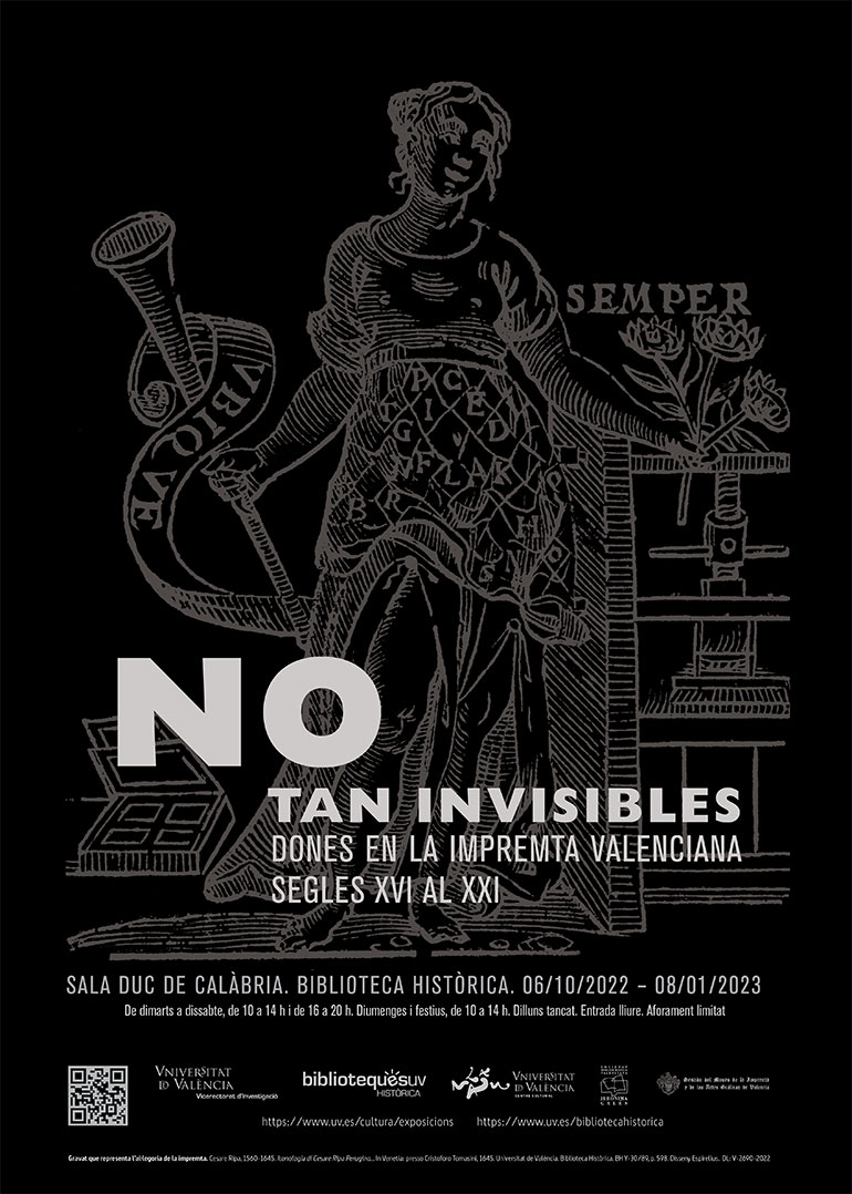 La Universitat de València presenta la exposición 'NO TAN INVISIBLES. Mujeres en la imprenta valenciana. Siglos XVI al XXI', un proyecto organizado por el Vicerectorat d’Investigació y la Biblioteca Històrica en colaboración con la Societat Bibliogràfica Valenciana Jerònima Galés y la Asociación de Amigos del Museo de la Imprenta de Valencia.