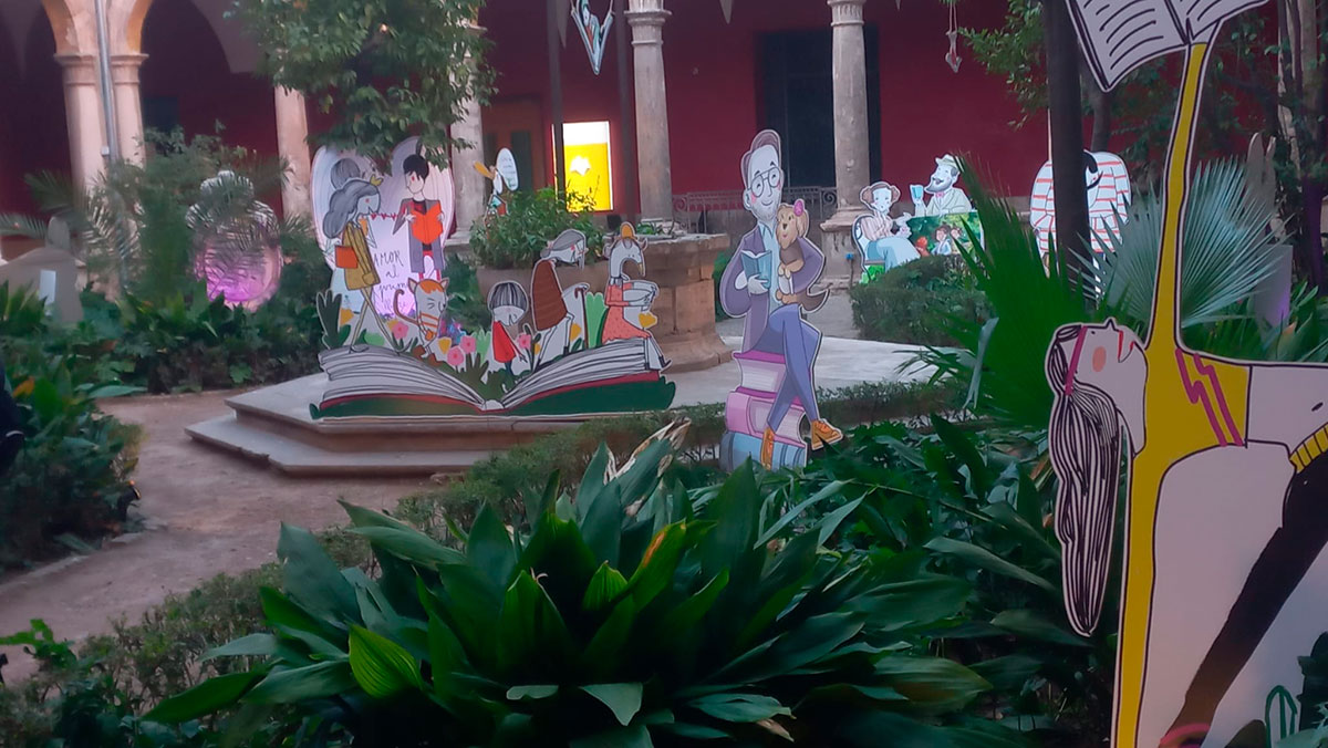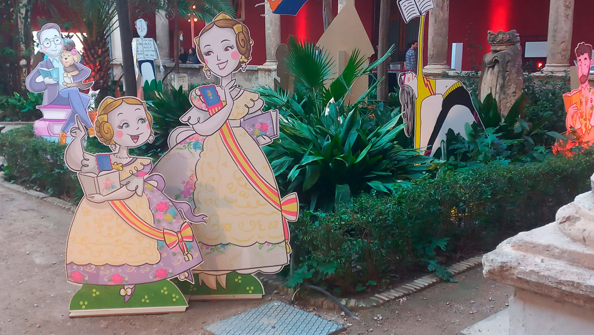 Entre la vegetación del claustro del antiguo convento, emerge una galería de personajes que representan escenas vinculadas con la lectura y enlazan con el imaginario del monumento municipal infantil, que gira en torno a la capitalidad verde europea de València de este 2024.