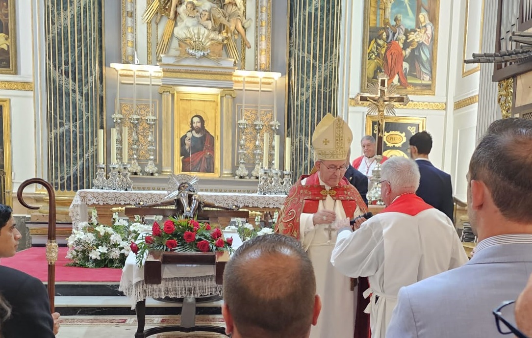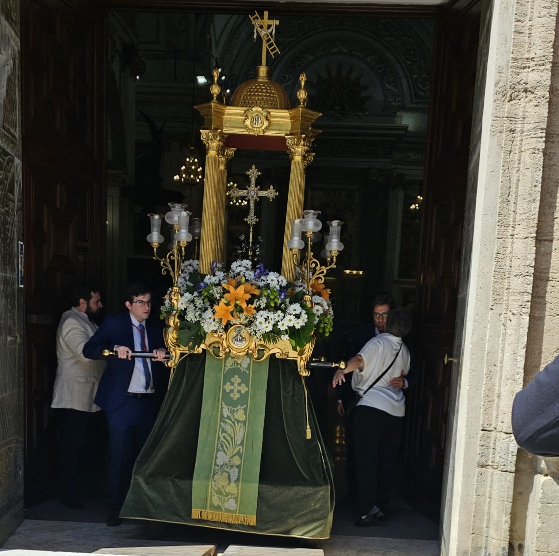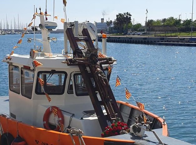 Previamente, el arzobispo de Valencia, don Enrique Benavent, había bendecido la iglesia de Santa María del Mar, epicentro de esta festividad y de tantas otras en el Grao, y a los feligreses que en ella se congregaban. Poco después, una numerosa comitiva salía del templo junto a la cruz parroquial y el Lignum Crucis, que abría el cortejo, hasta los alrededores del Edificio del Reloj, en la antigua Escalera Real, para recibir al Cristo sobre la escalera que llegaba desde el mar a bordo de un barco como es tradición.